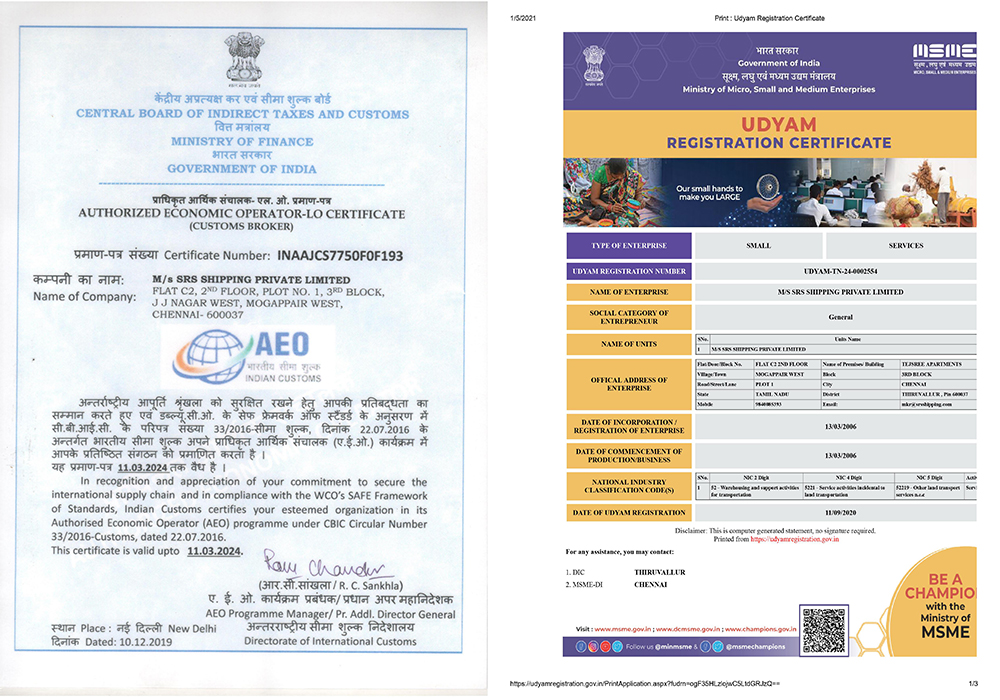 Holding own CHA licence issued by Chennai Custom House CHN-R.142-CHA and also Indian Customs Certified SRS Shipping Pvt Ltd as Authorised Economic Operator (AEO) INAAJCS7750FOF193